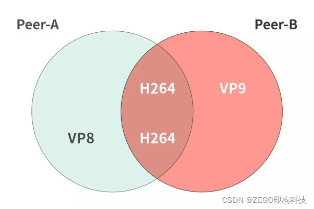 peer-A 和 peer-B 是视频互动的两边浏览器,他们通讯前必须在视频编码能力上先达成一致,如下图,最终协商出共同的H264,如果无法达成一致,则通讯失败。