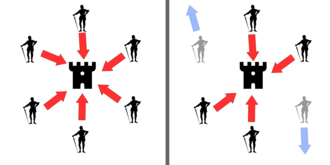 若假设所有六名将军协同进攻,则战斗获胜(左);有两名将军(叛徒)谎称打算进攻,但实际上撤退,则战斗失败(右)。